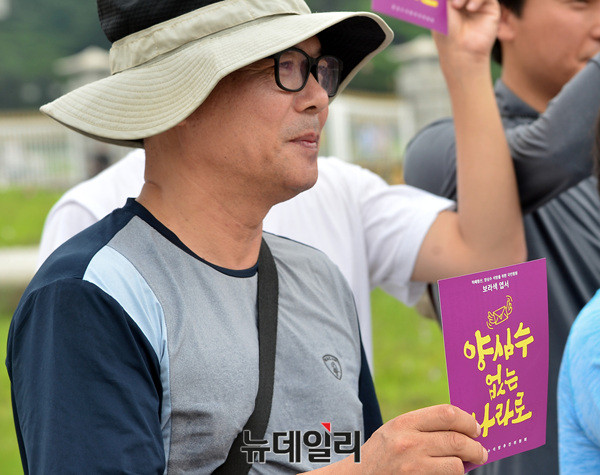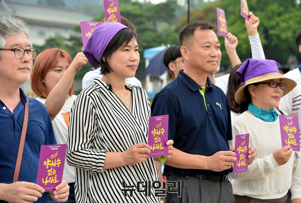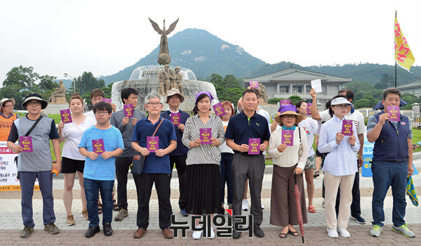 양심수석방추진위원회가 21일 오전 청와대 앞 분수대에서 가두행진을 마치고 '이석기 전 통합진보당 의원과 한상균 민주노총 위원장 등의 석방을 주장' 하는 집회를 벌이고 있다. 추진이는 앞서 광화문역에서 부터 지난 19일 청와대의 8·15 특별사면 불가 입장을 비판하며 가두행진을 이어왔다.