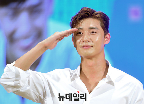 영화 '청년경찰(감독 김주환)'에서 의욕충만 행동파 기준 역을 맡은 배우 박서준이 21일 오후 서울 송파구 롯데월드 가든스테이지에서 열린 쇼케이스에서 경례를 하고 있다.