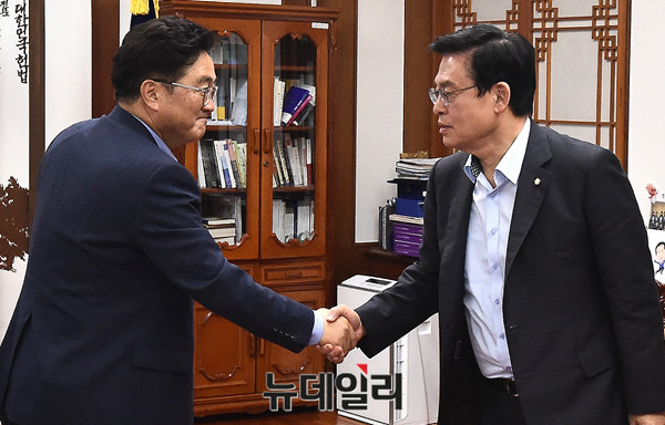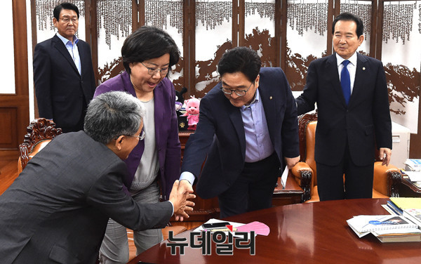 (왼쪽부터) 국민의당 김동철 원내대표, 바른정당 이혜훈 대표, 정세균 국회의장, 더불어민주당 우원식 원내대표, 자유한국당 정우택 원내대표.