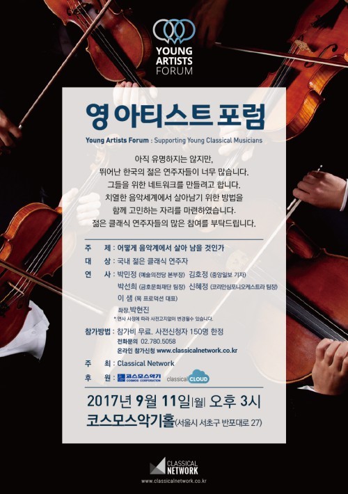 공연기획사 스테이지원과 봄아트프로젝트가 공동 주최하는 '제1회 영 아티스트 포럼'이 9월 11일 오후 3시 서초동 코스모스악기홀에서 '어떻게 음악계에서 살아남을 것인가'라는 주제로 열린다.