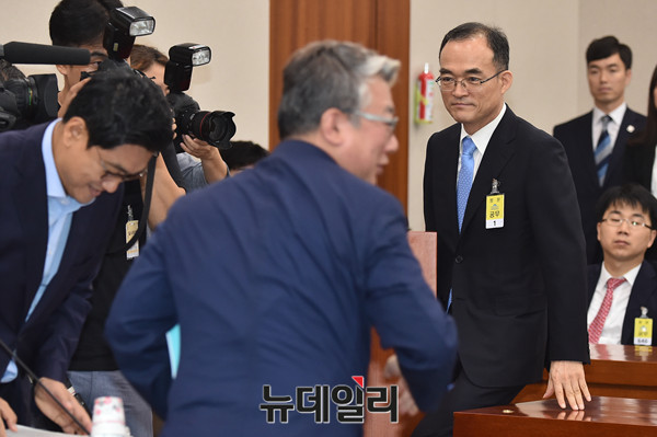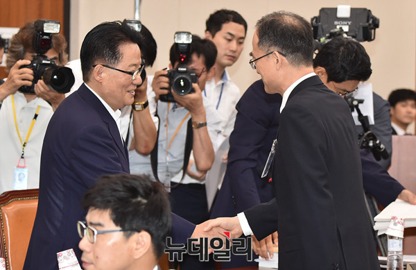 문무일 검찰총장 후보자가 24일 오전 국회에서 열린 법제사법위원회 인사청문회에 출석해 의원들과 인사를 나누고 있다.