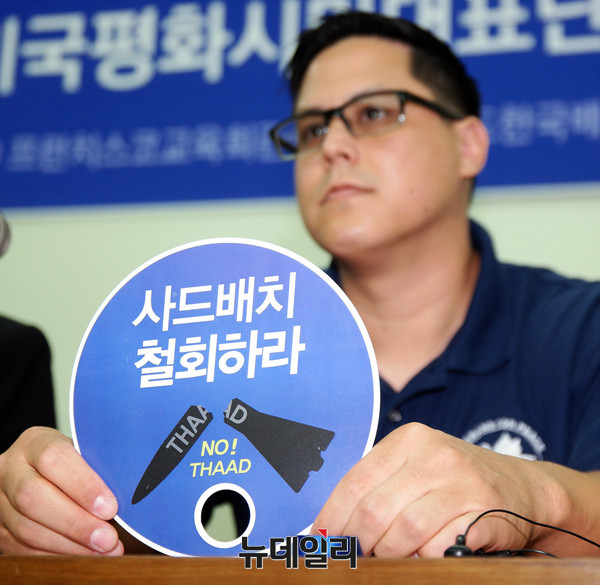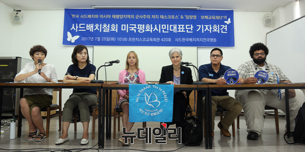 미국평화시민대표단이 25일 오전 서울 중구 프란치스코 교육회관에서 기자회견을 열고 한반도 고고도미사일방어체계(사드 THAAD) 배치 철회를 촉구하고 있다.