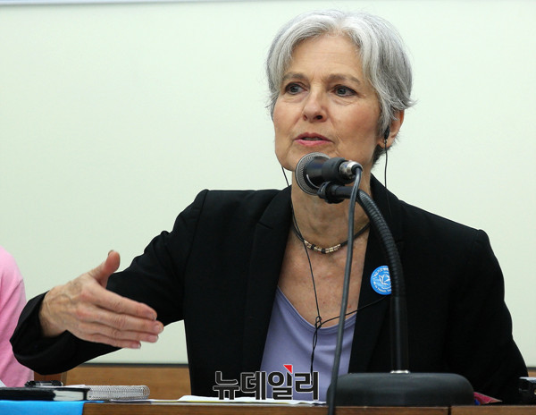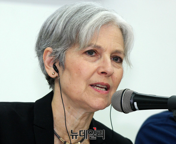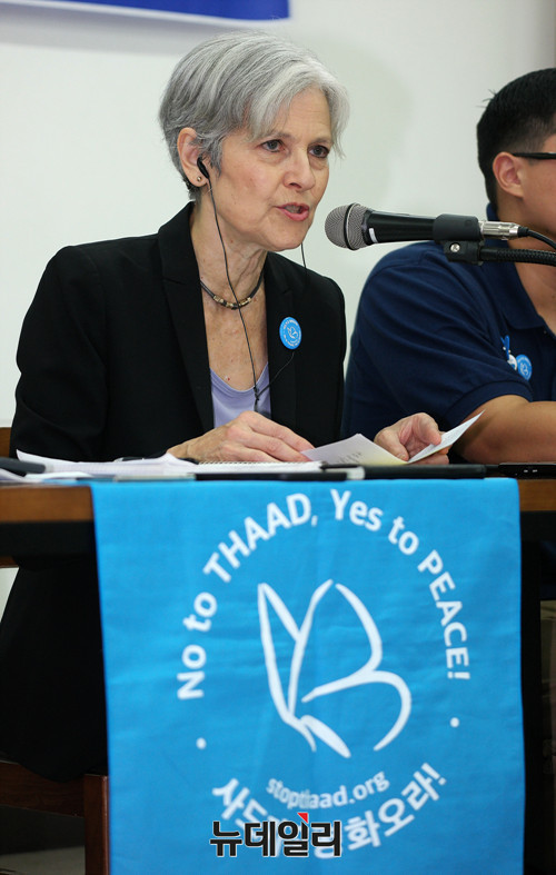 질 스타인(Dr. Jill Stein) 미국 녹색당 의원이 25일 오전 서울 중구 프란치스코 교육회관에서 열린 '사드배치철회 미국평화시민대표단 기자회견'에 참석해 발언하고 있다.