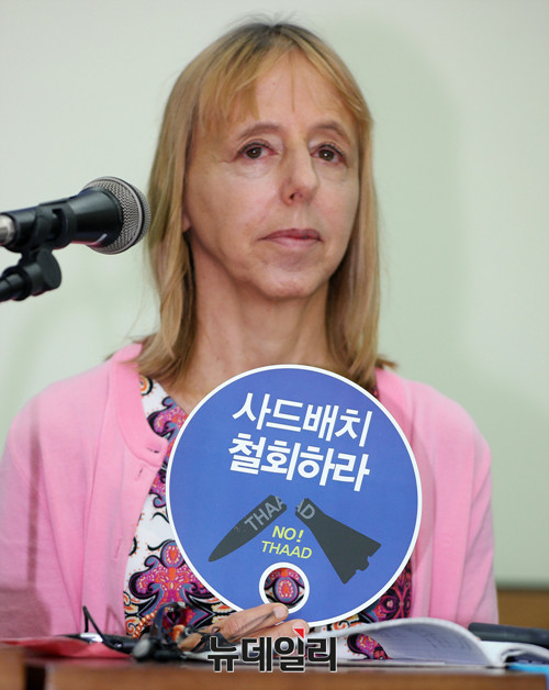 메데아 벤자민(Medea Benjamin) 미국여성평화단체 '코드핑크' 대표가 25일 오전 서울 중구 프란치스코 교육회관에서 열린 '사드배치철회 미국평화시민대표단 기자회견'에 참석해 발언하고 있다.