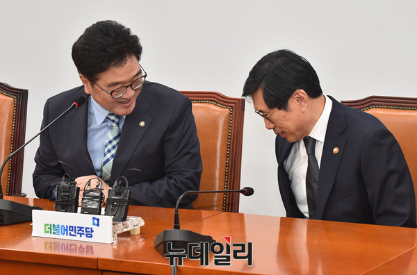 우원식 더불어민주당 원내대표가 25일 오후 국회 당 대표실을 찾은 박상기 신임 법무부장관과 대화를 나누고 있다.
