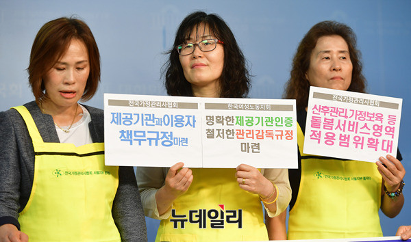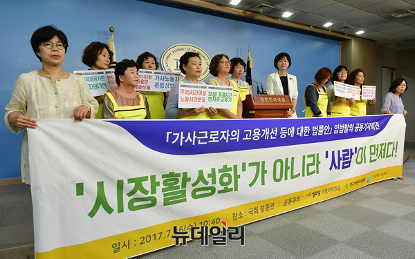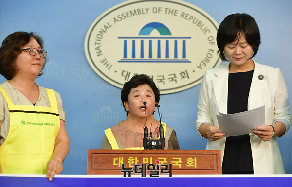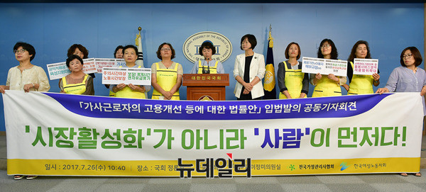 전국가정관리사협회를 비롯한 한국여성노동자회가 26일 오전 국회 기자회견장에서 이정미 정의당대표의 주관으로 '가사근로자의 고용개선 등에 대한 법률안' 입법발의 관련 기자회견을 하고 있다.