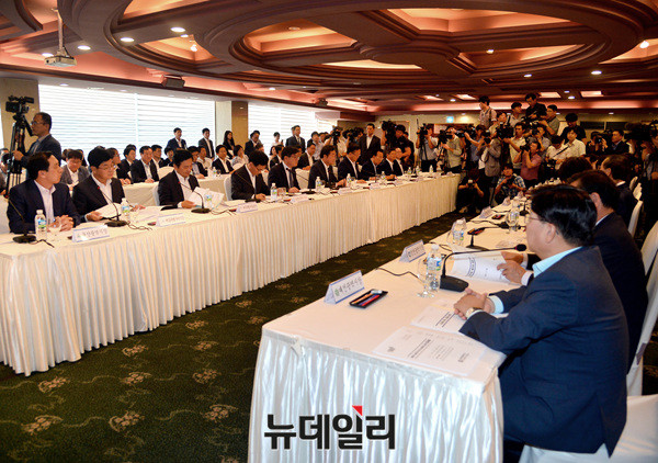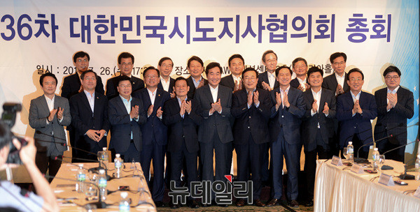 이낙연 국무총리와 김부겸 행정안전부 장관을 비롯한 전국 시도지사들이 26일 오후 서울 종로구 AW컨벤션센터에서 열린 '제36차 대한민국시도지사협의회 총회'에서 기념촬영을 하고 있다.