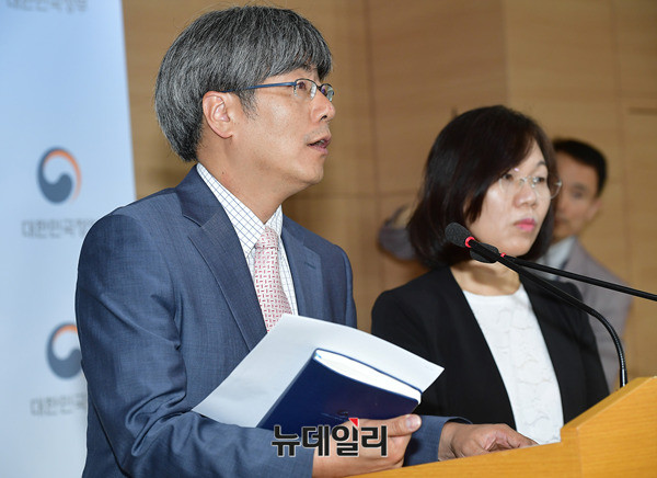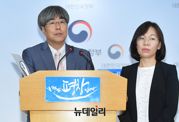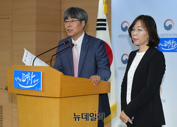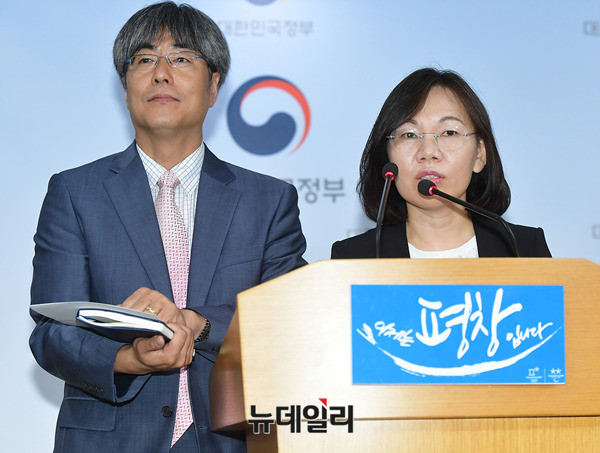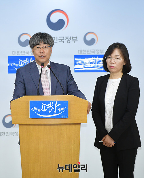 이희진 신고리 5·6호기 공론화위원회 대변인과 이윤석 부대변인(왼쪽)이 27일 오후 서울 종로구 정부서울청사 합동브리핑실에서 2차회의에 관련된 내용을 브리핑 하고 있다.