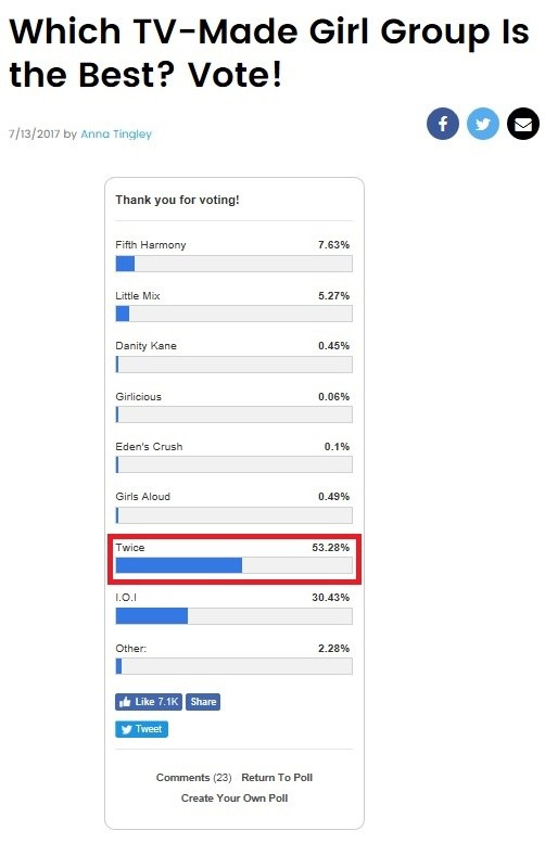 트와이스 외에 엠넷 '프로듀스 101'을 통해 선보인 I.O.I 및 영국 오디션 프로그램 'X-FACTOR' 출신 Fifth Harmony와 Little Mix, 영국 리얼리티 오디션 프로그램인 'Popstars: The Rivals'을 통해 배출된 Girls Aloud, MTV 오디션 프로그램 'Making the Band 3' 출신 Danity Kane 등이 후보로 올라 있는 가운데 27일 현재 트와이스는 이 투표에서 53.28%의 득표율로 선두를 달리고 있다.