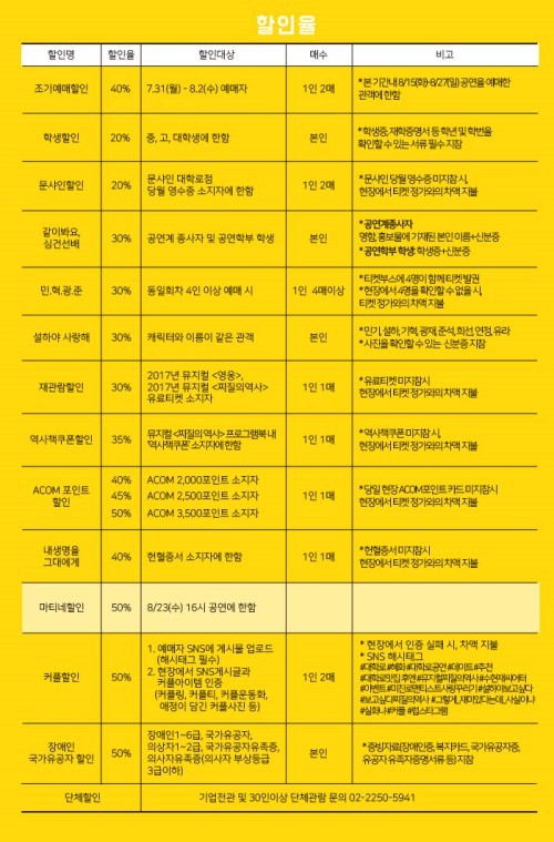 청춘 뮤지컬 '찌질의 역사'가 마지막 티켓을 오픈한다.'찌질의 역사' 5차 티켓 예매는 31일 오전 11시부터 인터파크에서 단독으로 판매되며, 토핑 회원은 오전 10시에 먼저 예매할 수 있다.5차 티켓 오픈 기간은 8월 15~27일 총 18회차 분으로, 7월 31일부터 8월 2일까지 조기예매하는 관객에게 40% 할인 혜택을 제공한다.특히, 여름방학을 맞아 8월 23일 수요일에 한해 마티네 공연을 추가했으며, 전석 3만원으로 뮤지컬을 즐길 수 있다.뮤지컬 '찌질의 역사'는 김풍 작가가 글을 쓰고 만화가 심윤수가 그린 동명웹툰이 원작으로, 20대에 막 접어든 청춘들의 연애 흑역사를 솔직하고 코믹하게 그린다.박시환, 박정원, 강영석, 정재은, 김히어라. 송광일, 이휘종, 황호진, 박수현, 윤석현, 손유동, 박란주, 허민진 배우가 출연하며, 8월 27일까지 대학로 DCF 대명문화공장 수현재씨어터에서 공연된다.