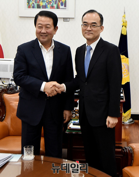 문무일 검찰총장이 1일 오전 국회 부의장실을 찾아 국민의당 박주선 비상대책위원장과 악수를 나누고 있다.