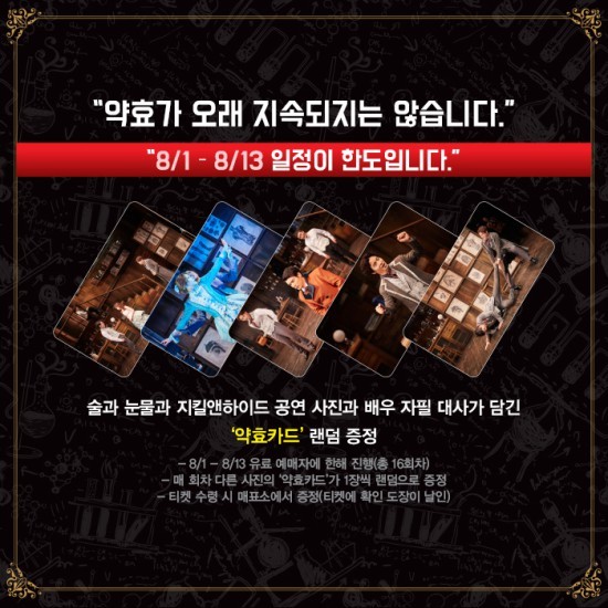 또, 8월 1일부터 13일까지 예매자들에게는 매 회차 다른 공연 사진과 배우들의 자필 대사가 담겨 있는 '약효 카드'를 준다.