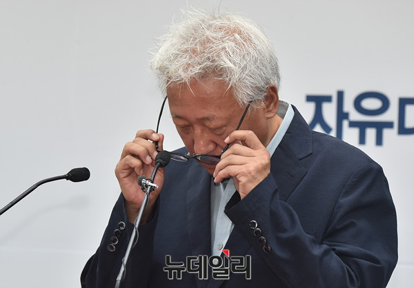 자유한국당 류석춘 혁신위원장이 2일 오전 서울 여의도 당사에서 혁신 선언문을 발표에 앞서 안경을 고쳐쓰고 있다.