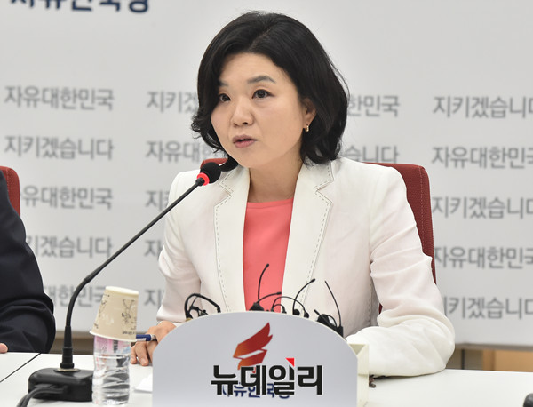 자유한국당 류여해 최고위원이 3일 오전 국회 당 대표실에서 열린 최고위원회의에서 발언을 하고 있다.