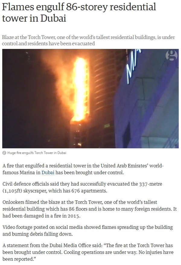 아랍에미리트(UAE) 두바이 마리나(Marina)에 위치한 86층짜리 초고층건물 '토치 타워(Torch Tower)'에서 대형 화재가 발생, 거주민들이 대피하는 소동이 벌어졌다.