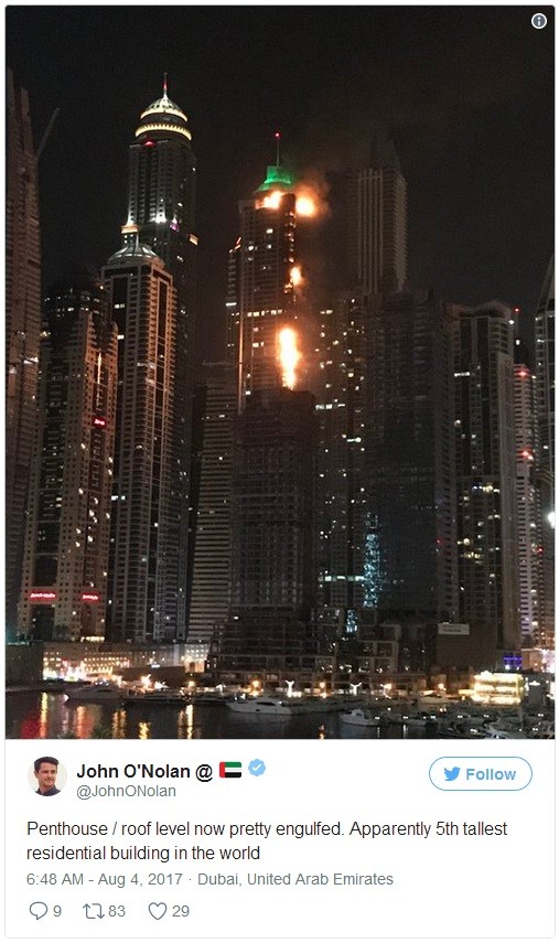 현지에서 화재 현장을 목격한 존 오 놀란(John O'Nolan) 씨는 "두바이 마리나 맞은 편에 있는 마천루에서 엄청난 불길이 치솟았다"며 "많은 파편들이 떨어졌고, 상층에서 발생한 불이 내부로 옮겨지는 것처럼 보인다. 현재 건물 주변의 전력이 완전히 차단된 상태"라고 전했다.