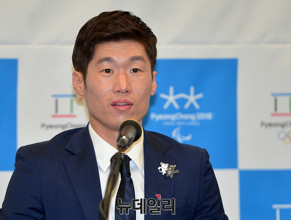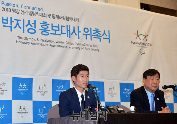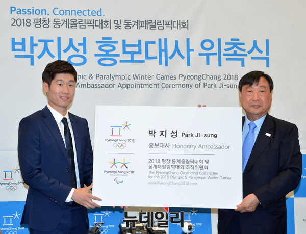 축구스타 박지성이 4일 오후 한국프레스센터에서 열린 '2018 평창 동계올림픽대회 및 동계패럴림픽대회 홍보대사 위촉식'에 참석해 이희범 위원장으로부터 대형 명함을 전달받고 있다. 박지성은 이번 위촉식으로 평창동계올림픽의 40번째 홍보대사가 됐다.