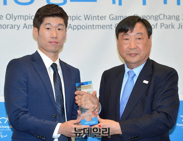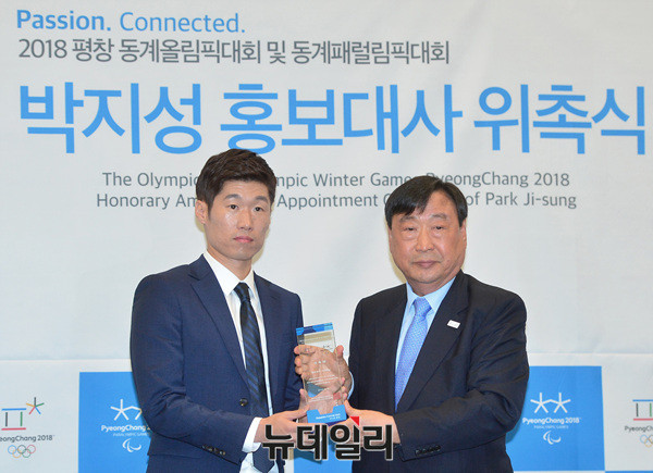 축구스타 박지성이 4일 오후 한국프레스센터에서 열린 '2018 평창 동계올림픽대회 및 동계패럴림픽대회 홍보대사 위촉식'에 참석해 이희범 위원장으로부터 위촉패를 전달받고 있다. 박지성은 이번 위촉식으로 평창동계올림픽의 40번째 홍보대사가 됐다.