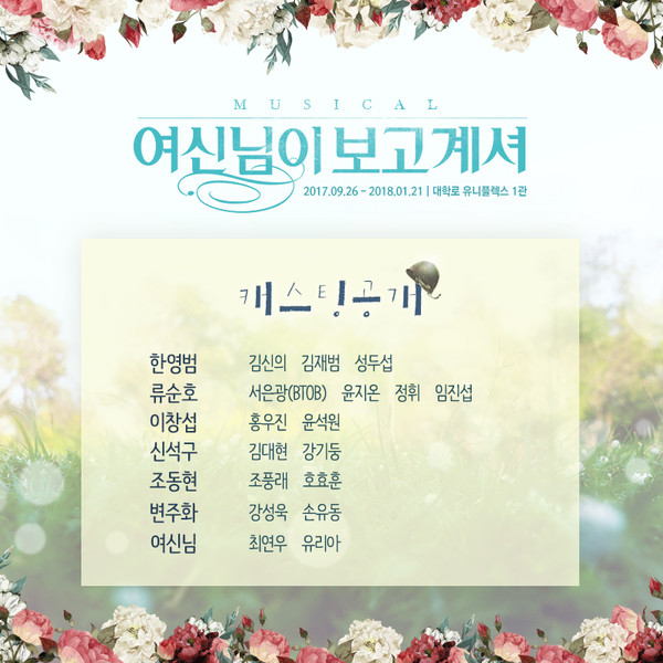 이번 공연에는 전 시즌에서 '여신'이었던 최연우를 비롯해 여섯 병사들의 탄탄한 연기력과 호소력 짙은 목소리, 여심을 자극시킬 훈훈한 외모까지 골고루 겸비한 배우들이 새롭게 캐스팅됐다.
