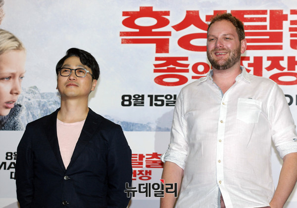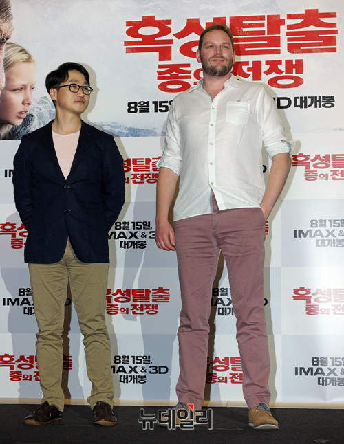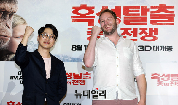 임창의 라이트닝 기술 감독과 앤더스 랭글랜즈 시각효과 감독이 7일 오후 서울 용산구 CGV아이파크몰에서 열린 영화 '혹성탈출: 종의 전쟁' 웨타 제작진 내한 프리젠테이션 및 기자간담회에 참석해 포토타임을 갖고 있다.