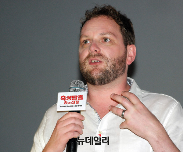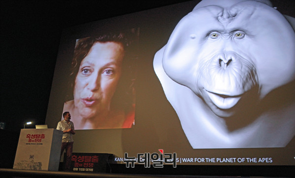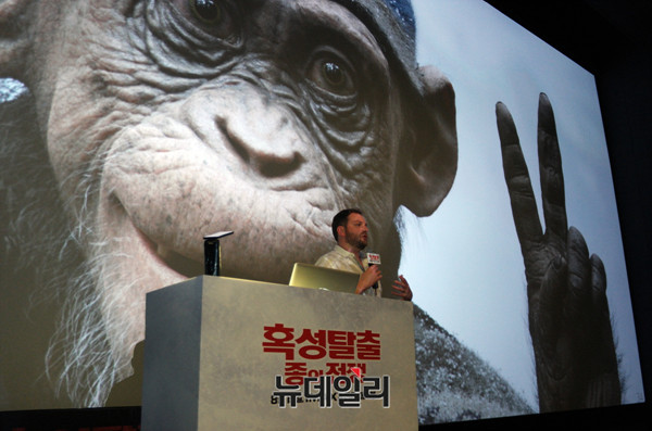 앤더스 랭글랜즈 시각효과 감독이 7일 오후 서울 용산구 CGV아이파크몰에서 열린 영화 '혹성탈출: 종의 전쟁' 웨타 제작진 내한 프리젠테이션 및 기자간담회에 참석해 프리젠테이션을 하고 있다.
