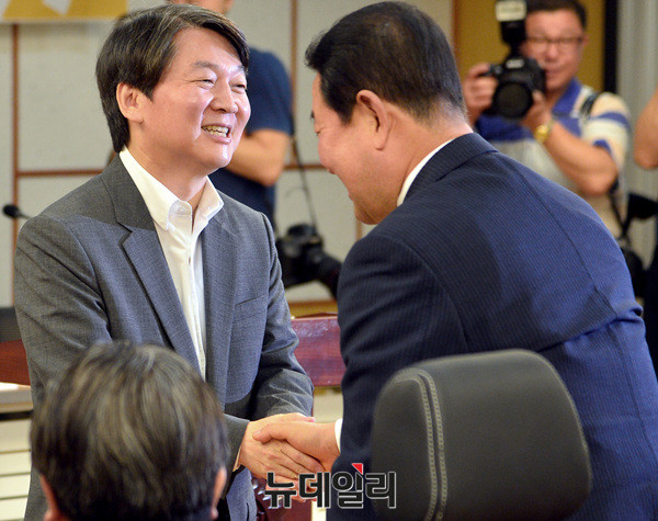 안철수 국민의당 전 상임공동대표와 박주선 비상대책위원장이 9일 오전 국회의원회관에서 열린 '국민의당 혁신의길2 : 정치전략 토론회'에서 악수하고 있다.