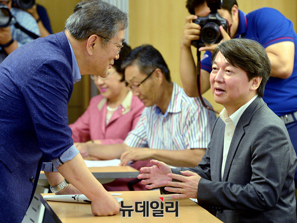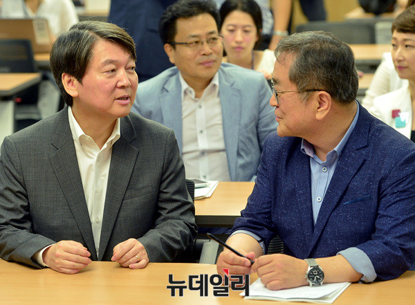 안철수 국민의당 전 상임공동대표와 김태일 혁신위원장이 9일 오전 국회의원회관에서 열린 '국민의당 혁신의길2 : 정치전략 토론회'에서 대화를 나누고 있다.