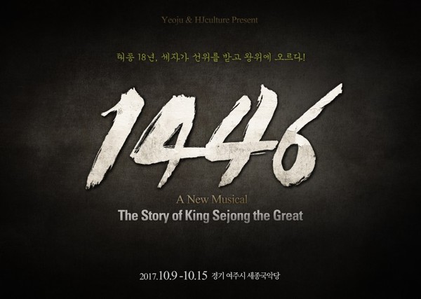 여주시와 HJ컬쳐가 올해 세종대왕 즉위 600돌을 기념해 공동제작하는 뮤지컬의 타이틀을 '1446'으로 확정하고 티저포스터와 캐스팅을 공개했다.세종대왕의 일대기를 그리는 뮤지컬 '1446'의 제목은 한글 창제라는 세계적인 위업을 달성한 세종대왕이 한글을 반포한 해에서 착안했다.HJ컬쳐는 "한글이 반포된 1446년은 대한민국의 역사를 새로 쓰고 새 시간을 여는 의미 있는 해인 만큼 그 시간을 기념하기 위해 공연의 최종 타이틀로 정하게 됐다"라고 밝혔다.이번 작품은 한글을 창제하고 반포하기까지의 세종대왕의 독창적인 리더십과 창의성을 조명하고 세종의 애민사상을 작품 속에 녹여 각박한 현실에 지친 이들에게 위로와 격려의 메시지를 전달할 예정이다.