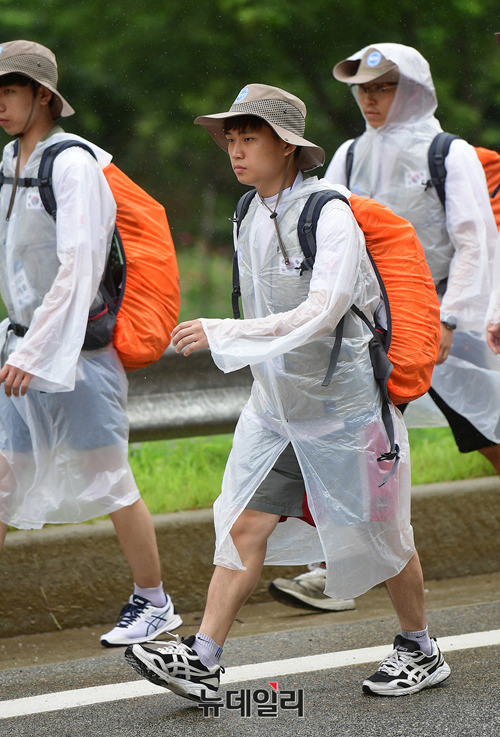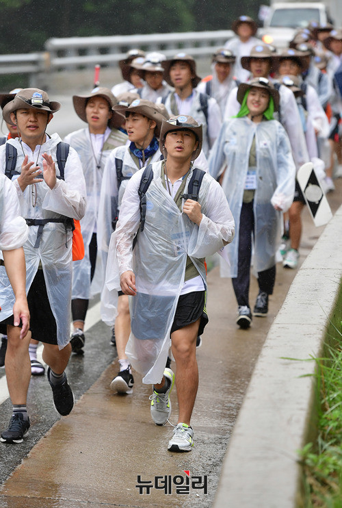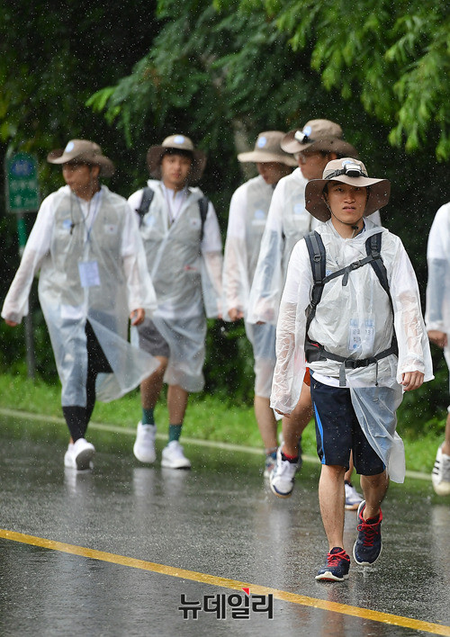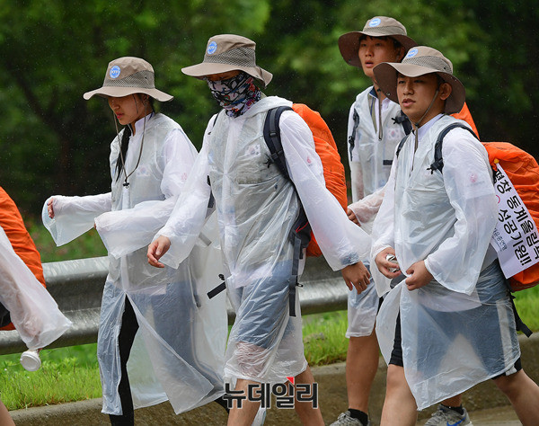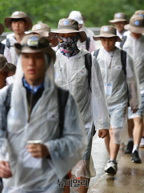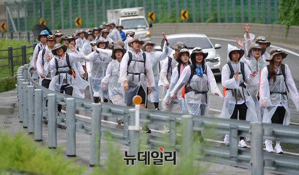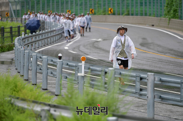DMZ 국토대장정 참가 대학생들이 10일 오전 비가 내리고 있는 강원 인제군 46번 국도를 걷고 있다. 이날 오전 고성군에서 출발한 참가자들은 백골병단전적비를 찾아 헌화하고, 참배했다.