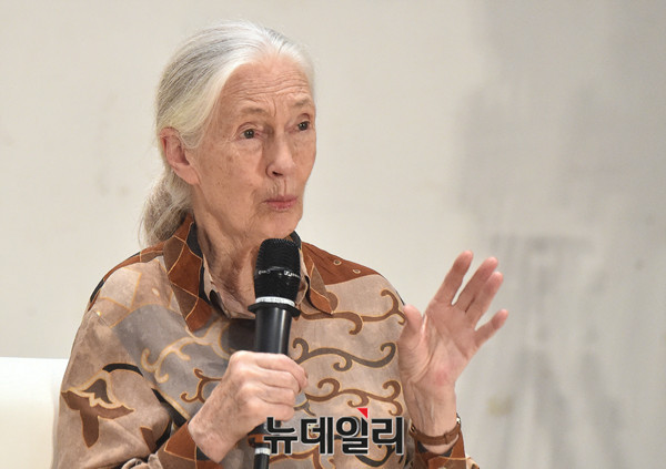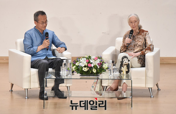 침팬지 연구가 겸 인류학자 제인 구달 박사가 10일 오후 국회 의원회관 대회의실에서 열린 '에코 토크'에서 최재천 이화여대 석좌교수와 대담회를 갖고 있다.