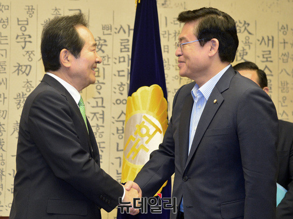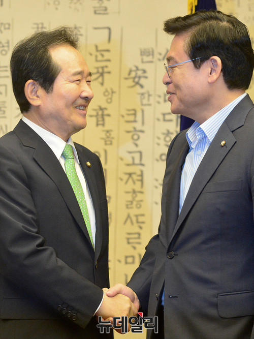 정세균 국회의장과 정우택 자유한국당 원내대표가 14일 오전 국회의장접견실에서 열린 여야 4당 원내대표 회동에 참석해 악수를 나누고 있다. 이날 정 의장과 원내대표들은 8월 임시국회의 일정과 국정감사를 포함한 정기국회 일정에 대해 논의할 예정이다.