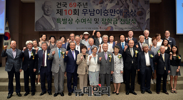 '제10회 우남 이승만 애국상 특별상' 수상자들이 14일 오후 한국프레스센터에서 열린 시상식에서 기념 촬영을 하고 있다. 대한민국사랑회가 주최한 우남 이승만 애국상은 자유 대한민국의 건국에 한 평생 헌신한 이승만 건국대통령의 애국·애족정신을 기리기 위해 제정됐다.