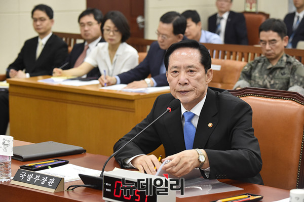 송영무 국방부 장관이 14일 오후 국회에서 열린 국방위원회 전체회의에 출석해 의원들의 질문에 답변하고 있다.