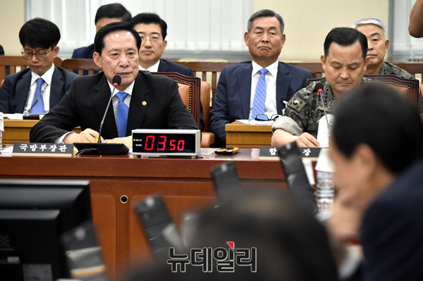 송영무 국방부 장관이 14일 오후 국회에서 열린 국방위원회 전체회의에 출석해 의원들의 질문을 경청하고 있다.