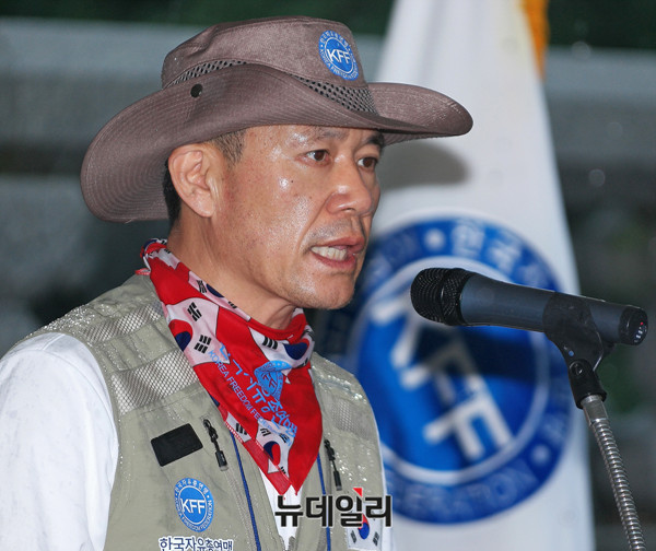 김준수 DMZ국토대장정 단장이 15일 오전 경기 파주시 임진각에서 열린 제8회 DMZ국토대장정 완주식에서 완주보고를 하고 있다.