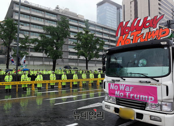 주권회복과한반도평화실현8·15범국민대회 참가자들이 15일 오후 서울 종로구 주한미국대사관 앞에서 가두행진을 하고 있는 가운데 한 관계차량이 주한미국대사관 앞에 정차돼 있다.