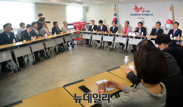 홍준표 자유한국당 대표가 16일 오전 서울 여의도 중앙당사에서 열린 '최고위원·3선의원 연석회의'에 참석해 악수를 나누고 있다.