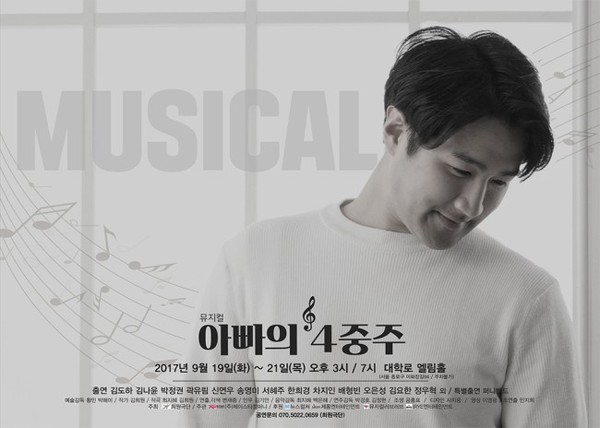 창작뮤지컬 '아빠의 4중주'는 9월 19일부터 21일까지 3일간 6차례(오후 3시, 7시) 대학로 엘림홀에서 공연한다.