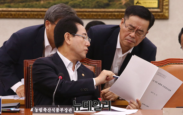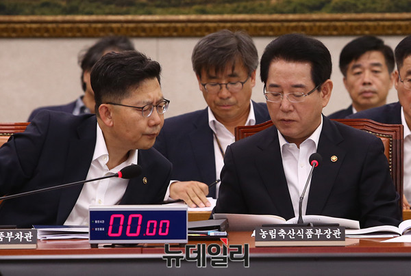 김영록 농림축산식품부 장관이 17일 오후 국회에서 열린 농림축산식품해양수산위원회 전체회의에서 국산 계란 살충제 안전관리대책 관련 현안보고에 앞서 보좌진과 대화를 나누고 있다.