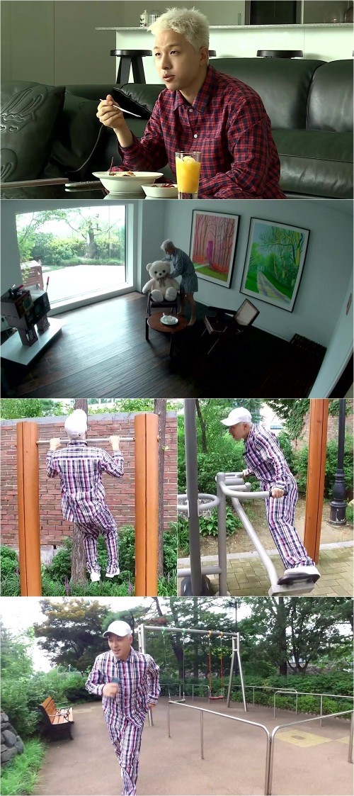 빅뱅 태양이 '동할배의 반전 일상'을 보여준다.태양은 18일 방송될 MBC 금요 예능 '나 혼자 산다'를 통해 데뷔 11년 만에 처음으로 집과 일상을 공개한다.우선 예술품이 가득한 태양의 집이 눈길을 끈다. 그의 집 곳곳에 조화롭게 커다란 그림을 포인트로 깔끔하게 정돈된 모습이 인상적이다. 특히 고 백남준 작가의 작품이 집 한 켠에 자리하고 있어 그의 예술 사랑을 짐작케 한다.하지만 이런 집 분위기와 대조를 이루는 태양의 할아버지 감성(?)의 반전 일상이 놀라움을 자아낸다. 흰색으로 머리를 탈색한 태양은 하루에 잠옷을 다섯 번 갈아입는 '잠옷 마니아'로, 독특한 잠옷 패션과 활용법을 소개한다.그는 공개된 사진처럼 잠옷의 하의를 배바지로 소화하면서 "윗도리를 넣으면 안정감이 들어요"라며 '잠옷 배바지 패션'의 장점을 적극적으로 어필했다.또, 태양은 조깅을 하면서도 '동할배'의 취향을 고스란히 드러냈다. 잠옷을 입은 채 집 근처 생활 체육 시설에서 정열의 운동을 했는데, 이 모습이 마치 약수터의 운동 고수 할아버지를 연상시킨다.무대 위에서 폭발적인 섹시 카리스마를 뿜어내던 빅뱅 태양의 반전 일상은 11일 오후 방송되는 '나 혼자 산다'를 통해 확인할 수 있다.['나혼자산다' 태양, 사진=MBC]