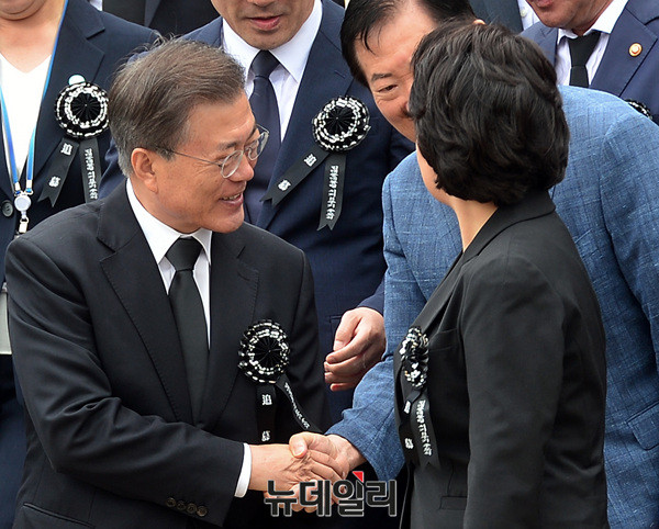 문재인 대통령과 부인 김정숙 여사가 18일 오전 서울 국립서울현충원 현충관에서 열린 김대중 전 대통령 서거 8주기 추도식을 마치고 악수를 나누고 있다.