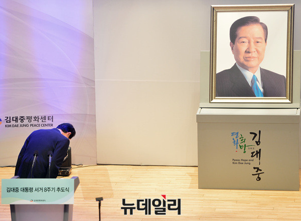 정세균 국회의장이 18일 오전 서울 국립서울현충원 현충관에서 열린 김대중 전 대통령 서거 8주기 추도식에 참석해 추도사를 하고 있다.