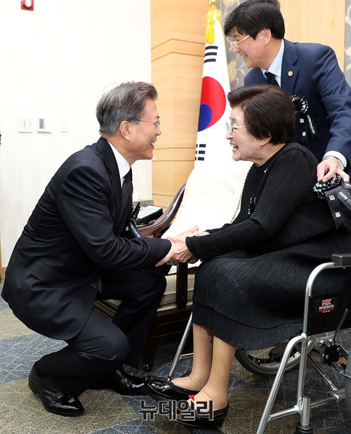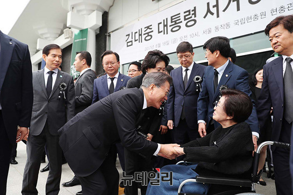 문재인 대통령이 18일 오전 서울 국립현충원 현충관에서 열린 故 김대중 대통령 서거 8주기 추도식에 앞서 故 김 대통령의 부인 이희호 여사와 환담을 나누고 있다.(사진=청와대)
