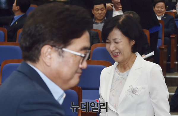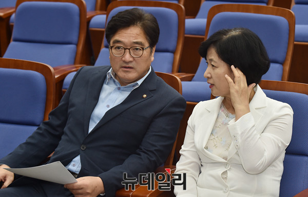더불어민주당 추미애 대표와 우원식 원내대표가 18일 오후 국회에서 열린 의원총회에서 모두발언을 하고 있다.