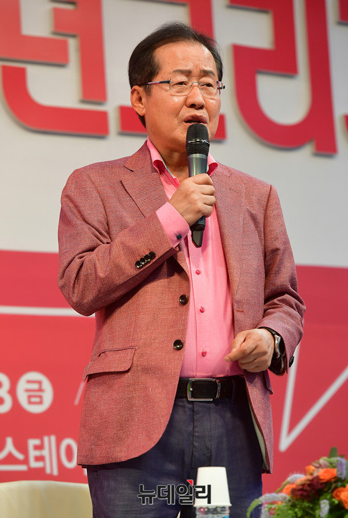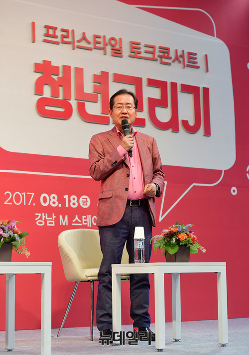 홍준표 자유한국당 대표가 18일 오후 대구와 울산에 이어 강남역 사거리를 찾아 토크콘서트를 열고 젊은이들과 소통에 나섰다. 무대에 오른 홍 대표가 인사말을 하고 있다.