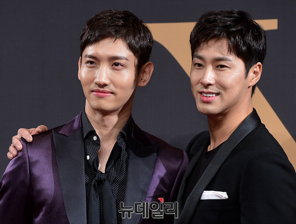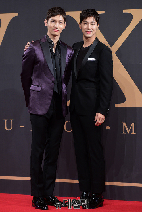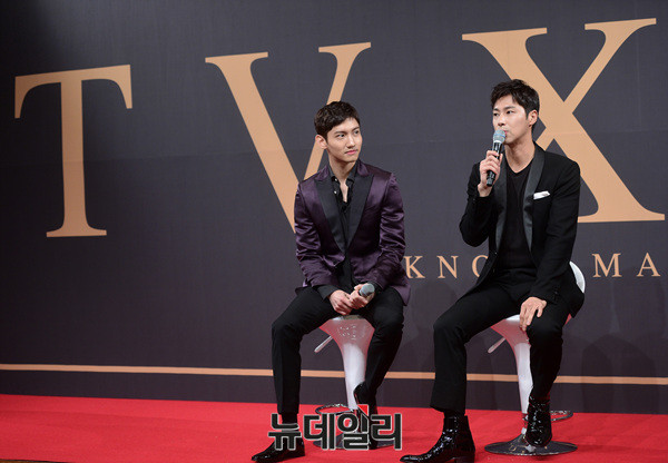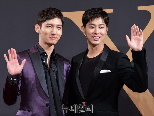 그룹 동방신기(東方神起)의 유노윤호와 최강창민이 21일 오전 서울신라호텔에서 열린 '아시아 프레스 투어(TVXQ! ASIA PRESS TOUR)' 기자간담회에 참석해 포토타임을 갖고 있다.