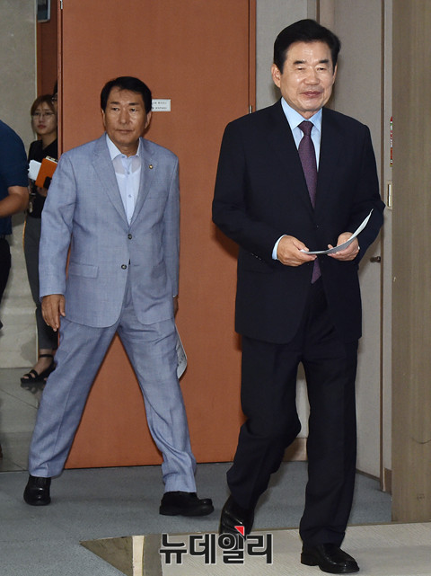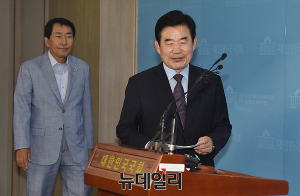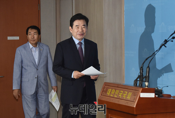 김진표 더불어민주당 의원이 21일 오전 국회 정론관에서 '종교인과세유예 법안 발의' 과련 기자회견을 위해 입장 하고 있다.