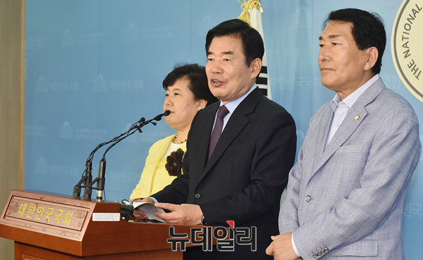 김진표 더불어민주당 , 자유한국당 안상수, 국민의당 조배숙 의원이 21일 오전 국회 정론관에서 '종교인과세유예 법안 발의' 과련 기자회견을 갖고 있다.