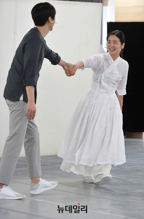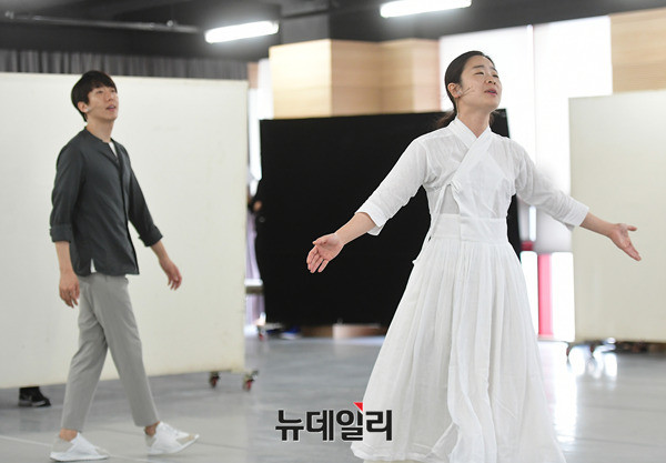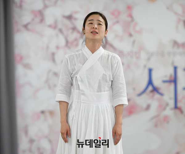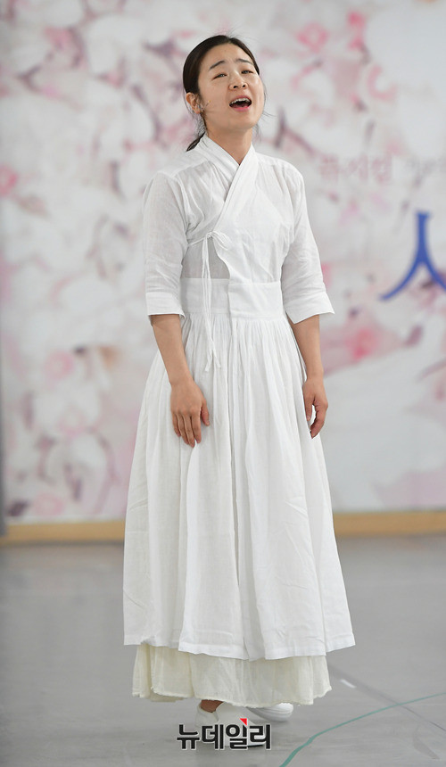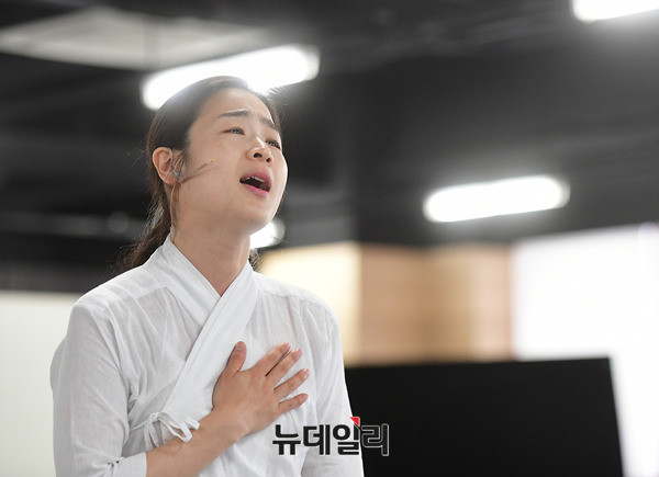 배우 이자람이 21일 오후 서울 강남구 BBCH아트홀 리허설룸에서 연습실 공개 행사에서 뮤지컬 서편제 중 하이라이트 장면을 시연하고 있다. 2014년에 이어 3년만에 무대에 오르는 창작뮤지컬 서편제는 오는 30일부터 11월 5일까지 광림아트센터 BBCH에서 공연된다.