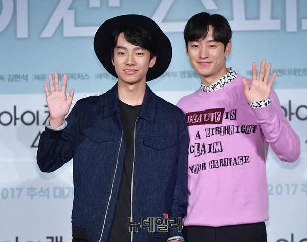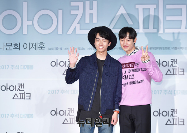 배우 성유빈, 이제훈(왼쪽부터)이 21일 오전 서울 광진구 롯데시네마 건대입구점에서 열린 영화 '아이 캔 스피크(감독 김현석)' 제작보고회에서 포토타임을 갖고 있다.